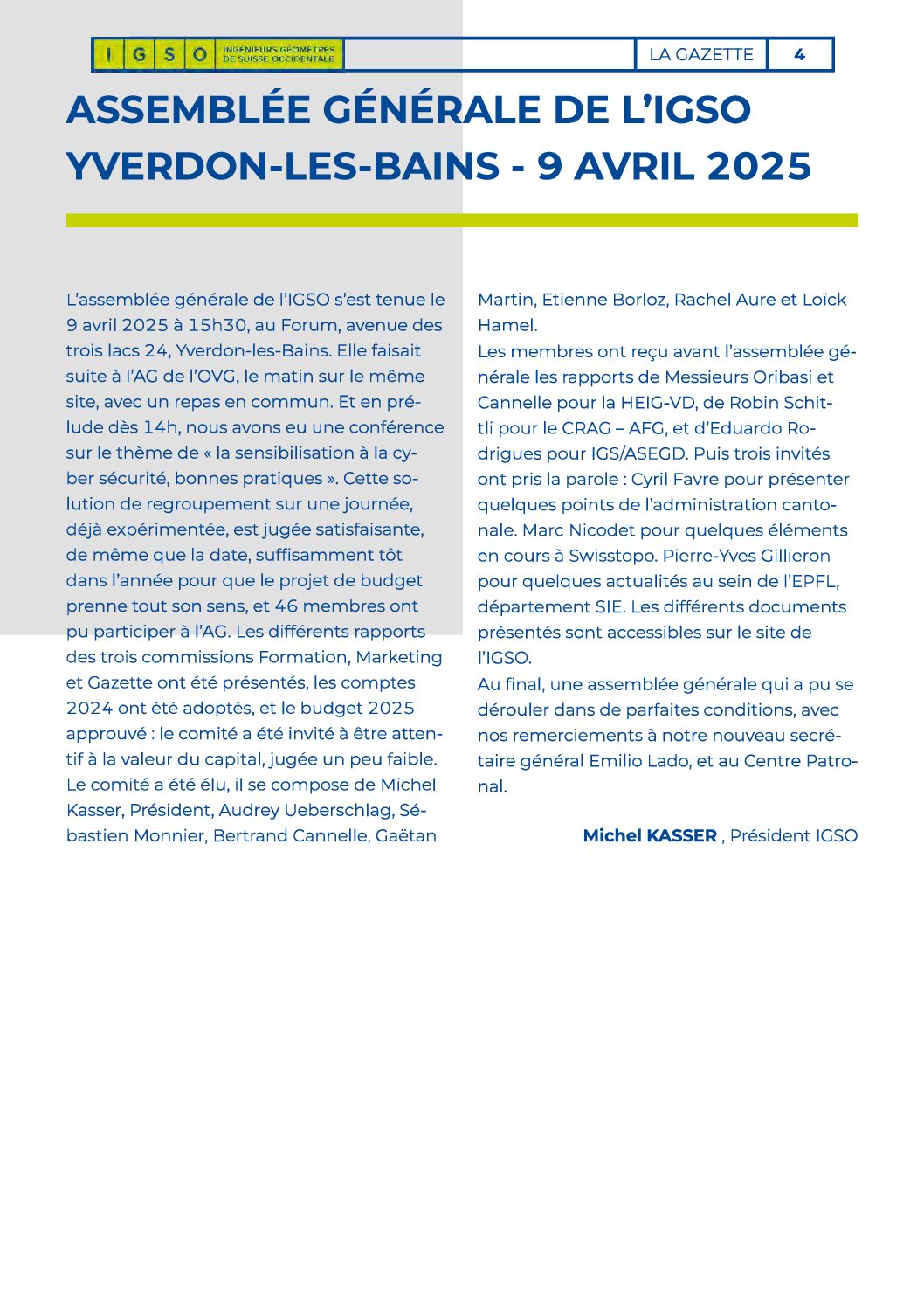 VIE D'IGSO Assemblée générale IGSO 2020 L’assemblée générale ordinaire 2020 d’IGSO s'est tenue le...